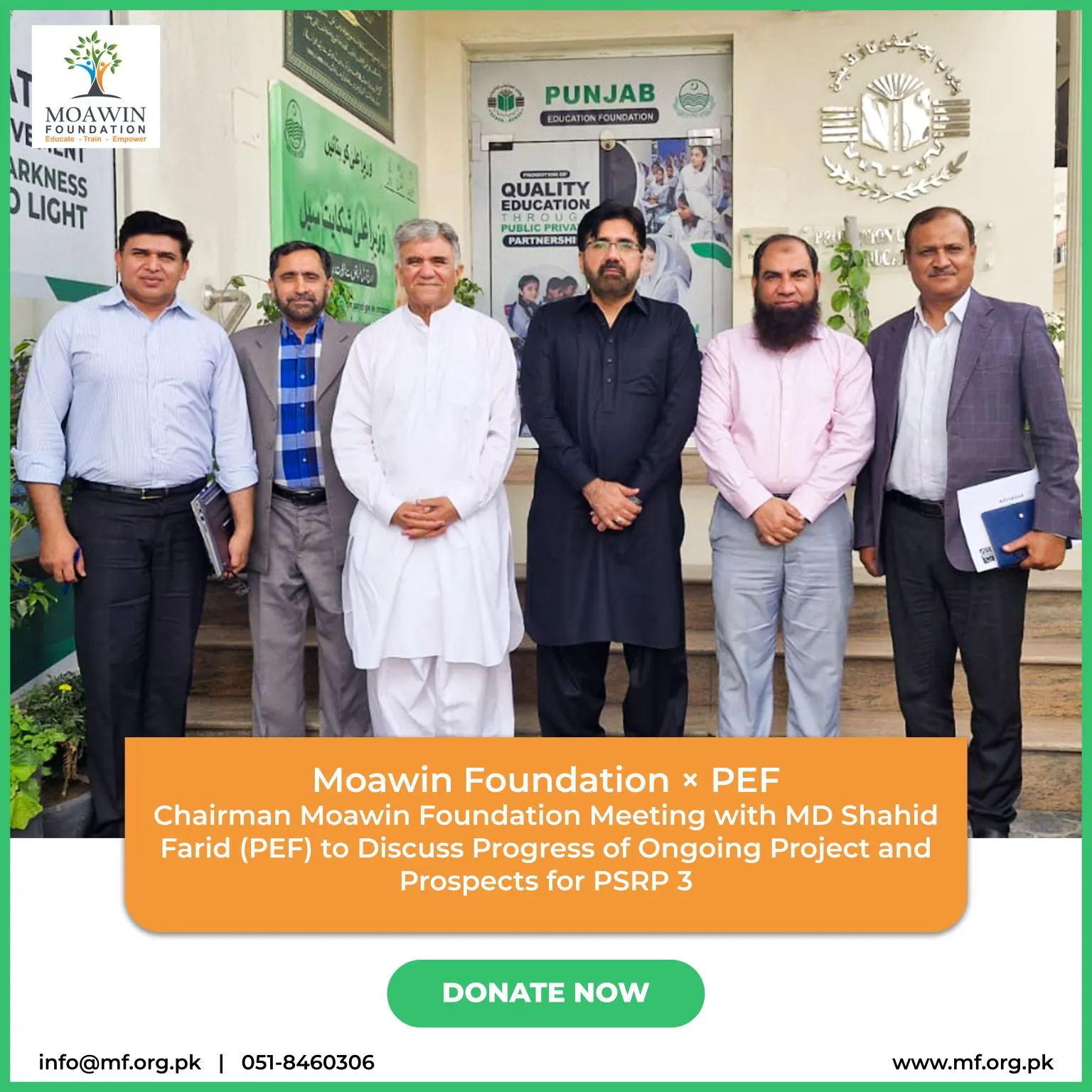 Under the leadership of Admiral (R) Asif Sandila, Moawin Foundation continues to work toward strengthening education systems and expanding learning opportunities across Pakistan. As part of these ongoing efforts, the foundation recently held a productive meeting with Shahid Farid from Punjab Education Foundation to discuss the progress of current education initiatives and explore new avenues for collaboration.
